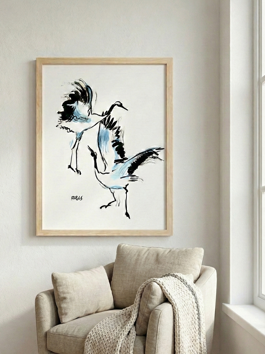 - El trazo es enérgico y fragmentado, construido a partir de líneas negras decididas y manchas azules que atraviesan los cuerpos. Las alas abiertas y los saltos sugieren una coreografía de disputa, pero contenida por el ritmo común. La acuarela se desplaza con rapidez, dejando zonas inacabadas y gestos superpuestos que refuerzan la sensación de impulso.